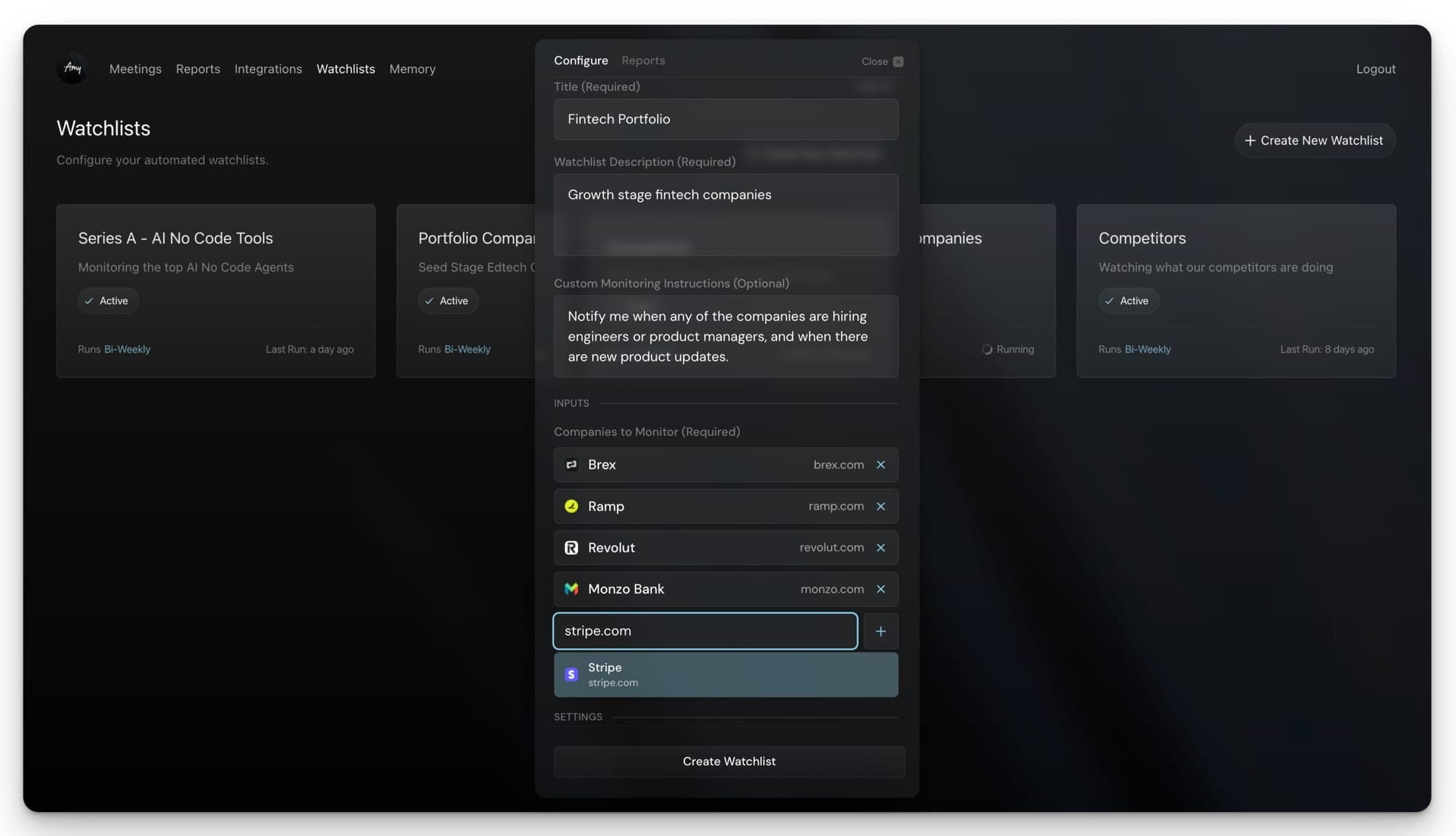 You can now build watchlists of companies, and have Amy autonomously monitor each company on a watchlist, and report back of any key changes - positive or negative.